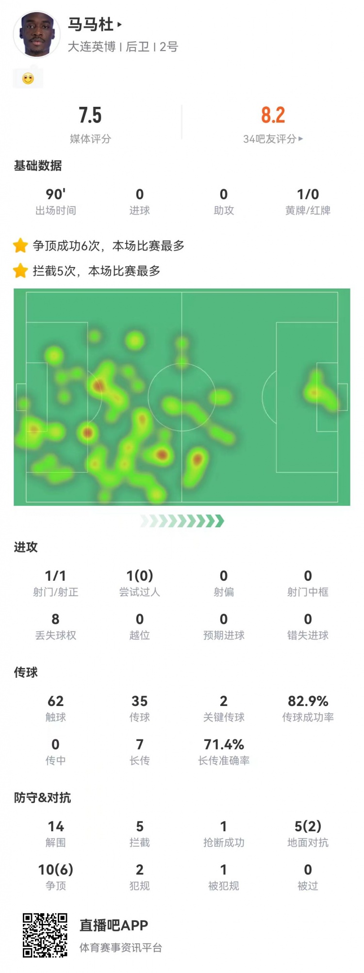 在大连英博0-2青岛西海岸的比赛中,马马杜评分7.5分,打满全场,吃到一张黄牌。