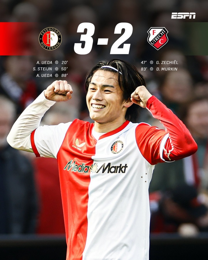 荷甲射手王!上田绮世双响+绝杀助费耶诺德登顶,8轮荷甲进8球...