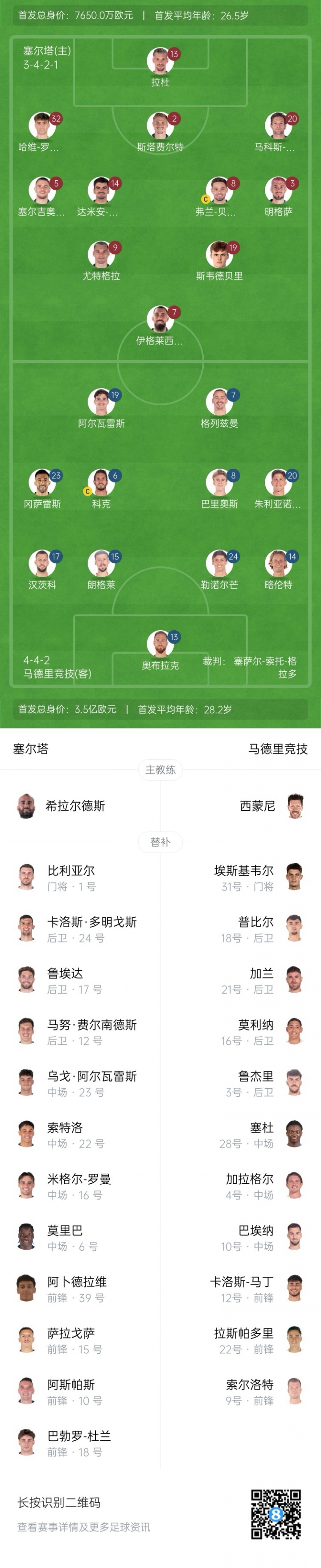 马竞目前3胜3平1负,暂排西甲第七。塞尔塔5平2负,暂排第18。