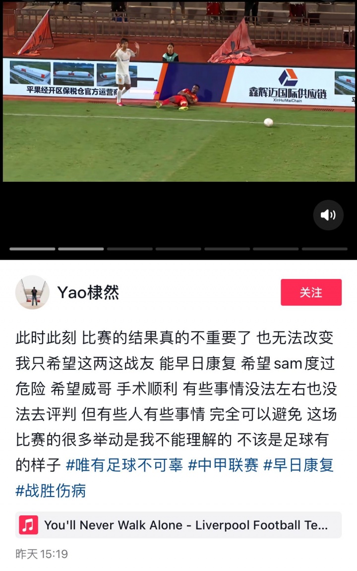 广西平果球员姚棣然在社媒写道,“此时此刻,比赛的结果真的不重要了,也无法改变。我只希望这两这战友,能早日康复,希望sam(阿萨莫阿)度过危险,希望威哥(黄威)手术顺利。有些事情没法左右也没法去评判,但有些人有些事情,完全可以避免。这场比赛的很多举动是我不能理解的,不该是足球有的样子”。