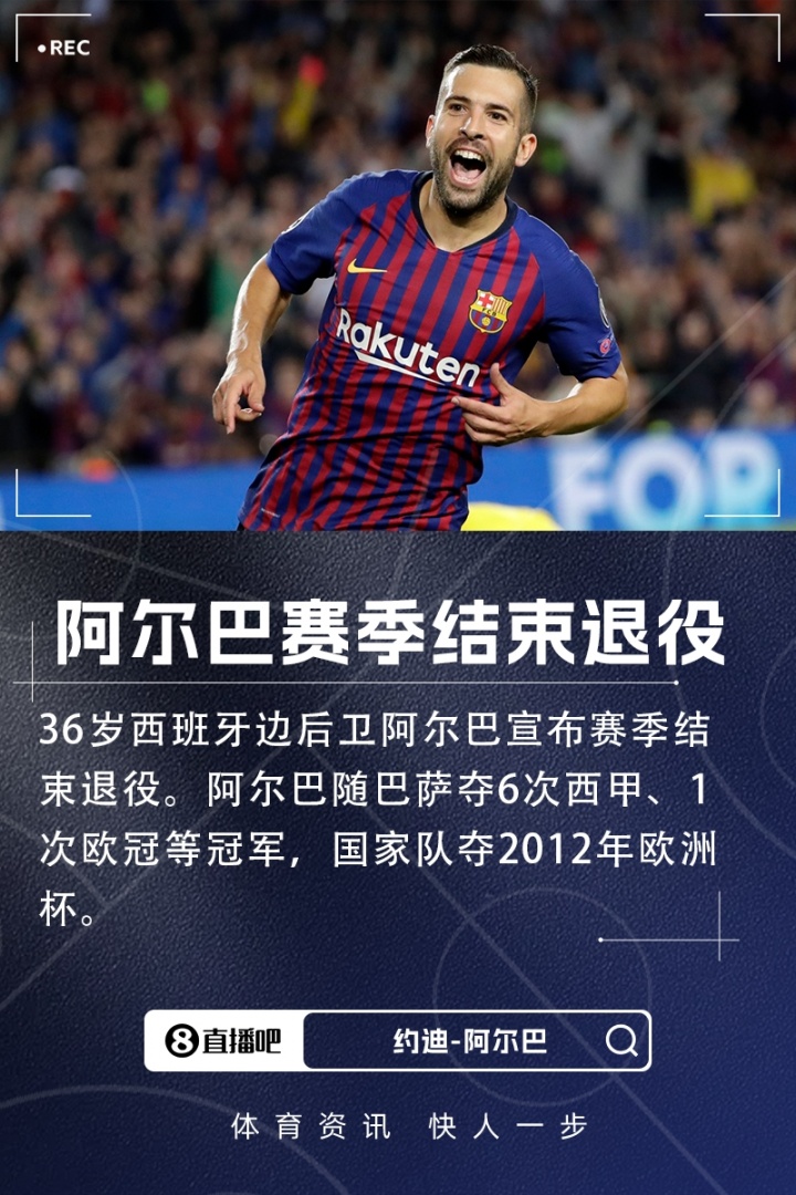 告别!官方:36岁巴萨传奇后卫阿尔巴宣布赛季末退役
