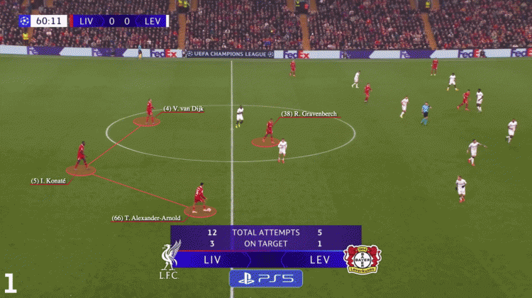 第一招是靠他持球强突那些逼抢力度不足的防线。等各路对手回过味来开始重点围剿他时,红军立马亮出B计划——让阿诺德和罗伯逊这两大边后卫充当后场发动机。下图迪亚斯在安菲尔德对阵勒沃库森时的欧冠开场球,就是经典教案:
