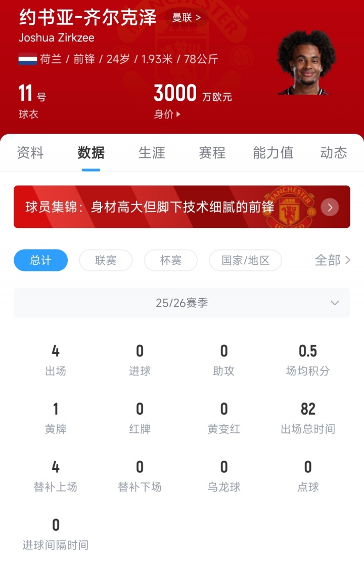 在今年夏窗曼联签下舍什科、姆贝莫、库尼亚三叉戟后,齐尔克泽的地位被彻底边缘化。本赛季曼联8场比赛齐尔克泽均进入名单,但没有获得一次首发机会,仅替补登场4次,总计出场82分钟,没有取得进球或助攻。