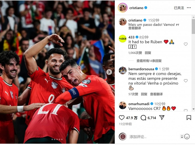 击败爱尔兰!C罗社媒晒照庆祝胜利:又迈出一步,加油!...