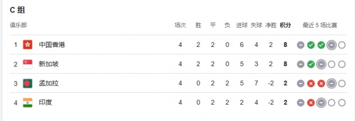 至此,印度4场比赛2平2负仅积2分,落后新加坡和中国香港6分。按规则只有小组第1才能晋级亚洲杯,在新加坡和中国香港还有1场对决的情况下,印度已经提前2轮无缘亚洲杯正赛。